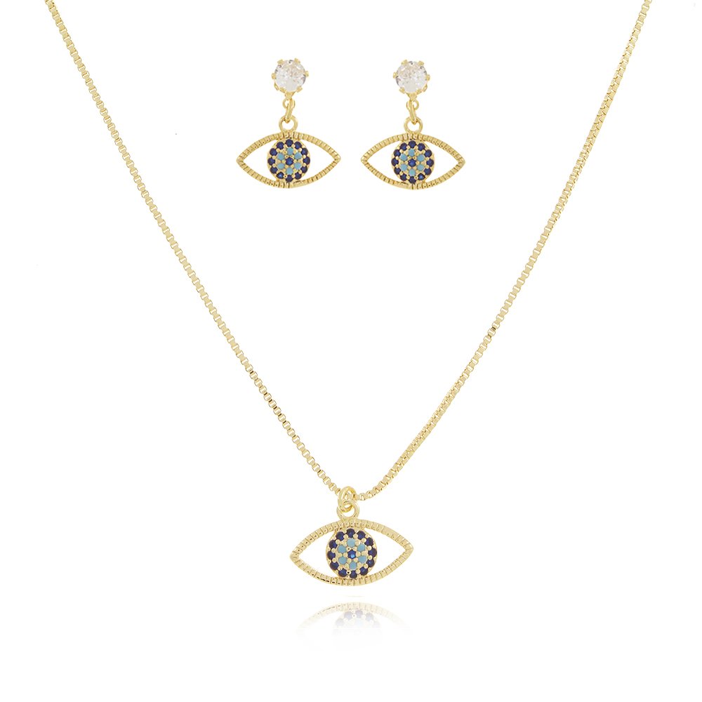 Encante-se com esse conjunto!Este lindo CONJUNTO OLHO GREGO CRAVEJADO DE ZIRCÔNIAS é feito com LATÃO BANHADO A OURO 18K de alta qualidade.
