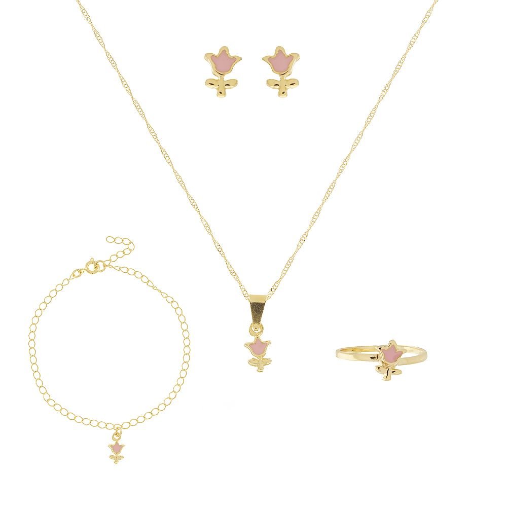 Encante-se com esse conjunto!Este lindo conjunto INFANTIL DE FLOR RESINADO ROSA é feito com LATÃO BANHADO A OURO 18K de alta qualidade.