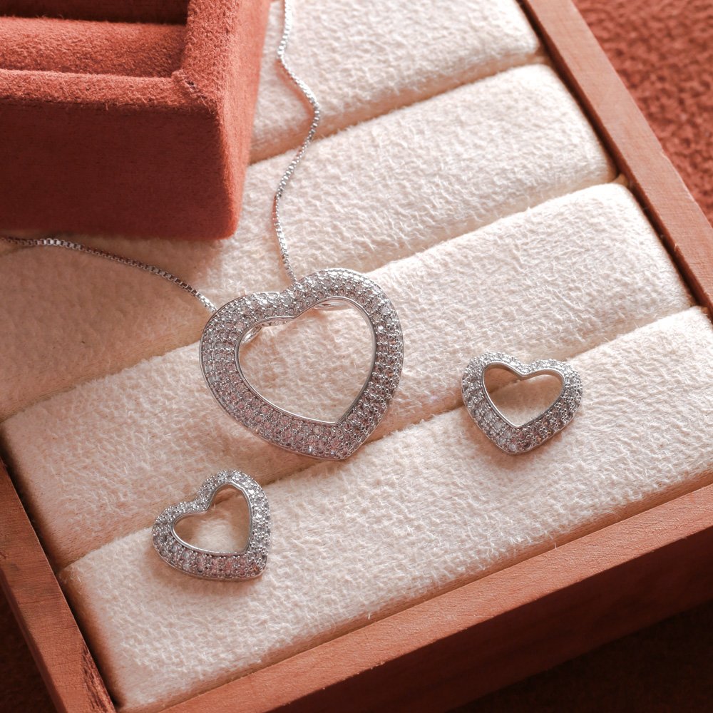 Encante-se com esse conjunto!Este lindo conjunto DE CORAÇÃO VAZADO CRAVEJADO DE ZIRCÔNIAS CRISTAIS é feito com LATÃO BANHADO A RÓDIO BRANCO de alta qualidade.