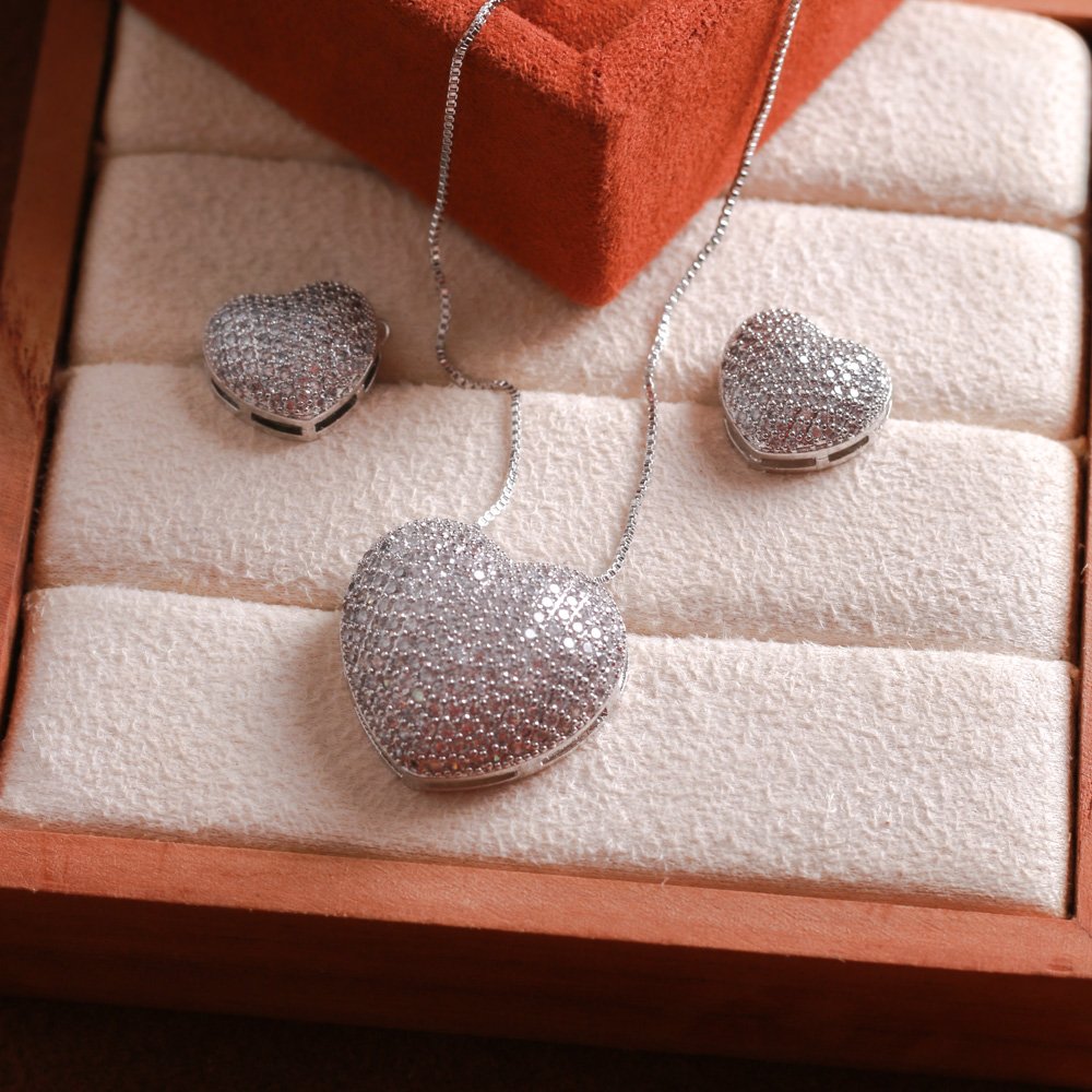 Encante-se com esse conjunto!Este lindo conjunto DE CORAÇÃO CRAVEJADO CRISTAL é feito com LATÃO BANHADO A RÓDIO BRANCO de alta qualidade.