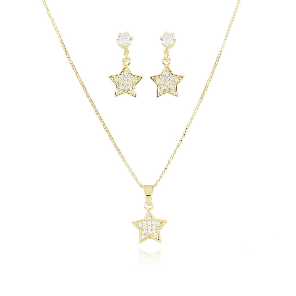 Encante-se com esse conjunto!Este lindo conjunto DE ESTRELA CRAVEJADO DE ZIRCÔNIAS CRISTAL é feito com LATÃO BANHADO A OURO 18K de alta qualidade.