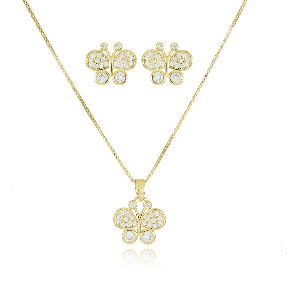 Encante-se com esse conjunto!Este lindo conjunto DE BORBOLETA CRAVEJADO CRISTAL é feito com LATÃO BANHADO A OURO 18K de alta qualidade.
