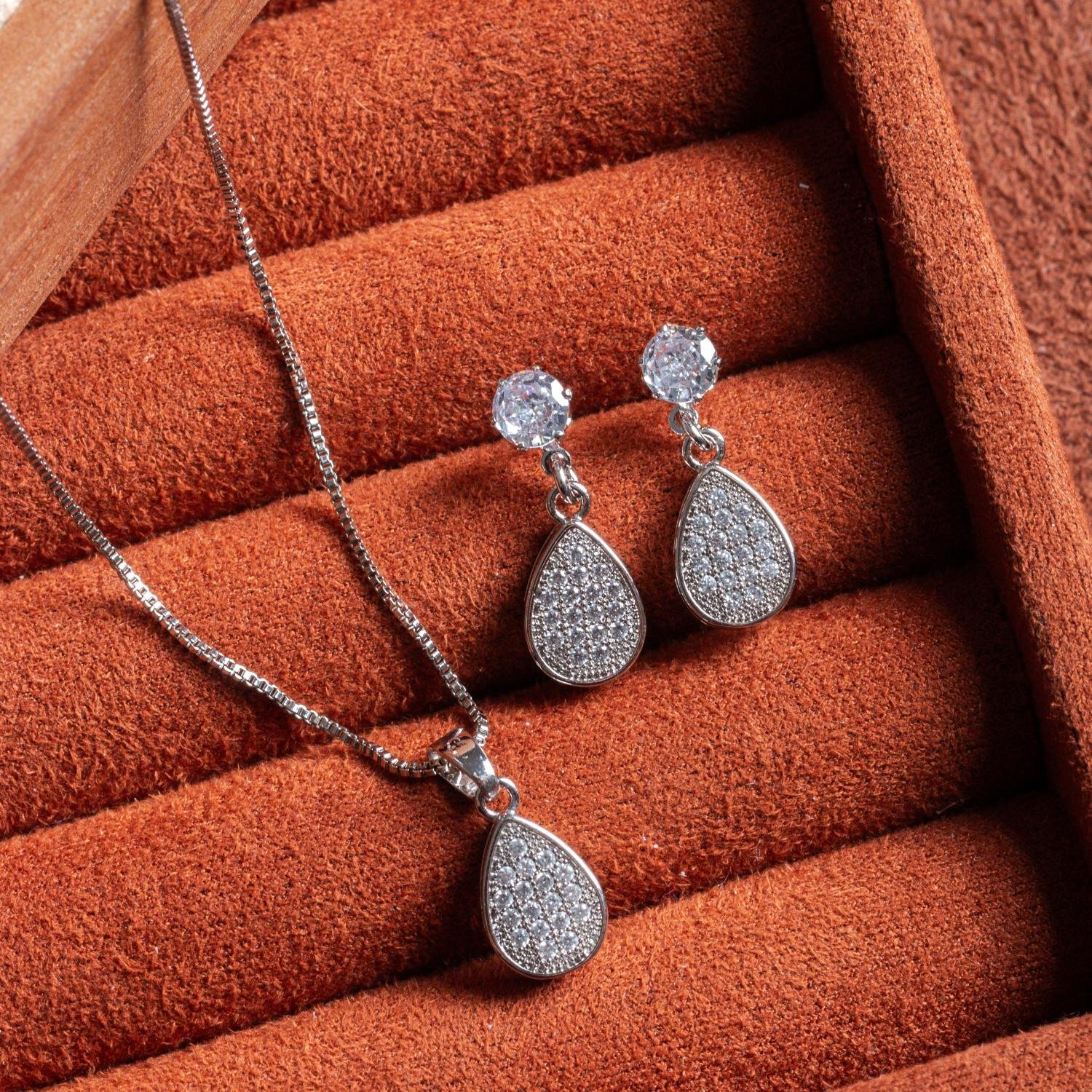 Encante-se com esse conjunto!Este lindo conjunto GOTA CRAVEJADA DE ZIRCÔNIAS CRISTAIS é feito com LATÃO BANHADO A RÓDIO BRANCO de alta qualidade.