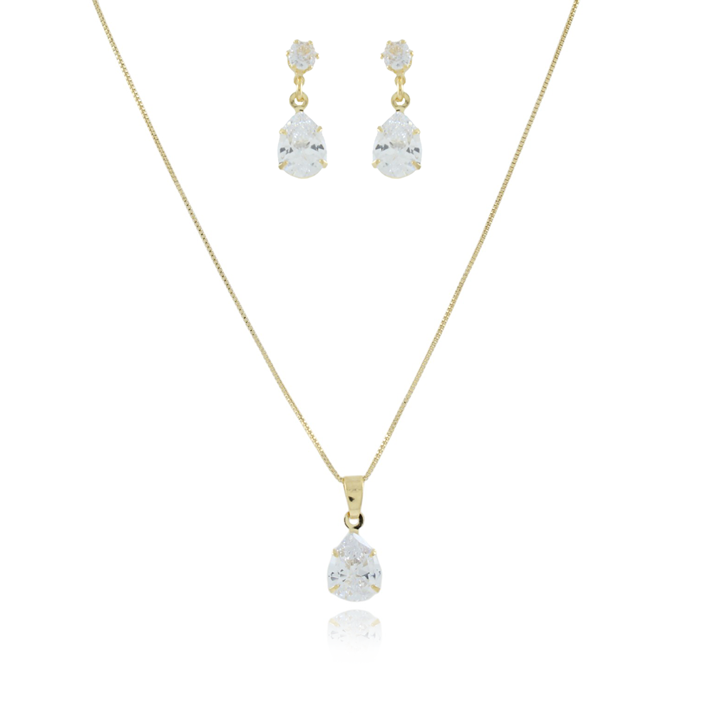Encante-se com esse conjunto!Este lindo conjunto GOTA CRISTAL é feito com LATÃO BANHADO A OURO 18K de alta qualidade.