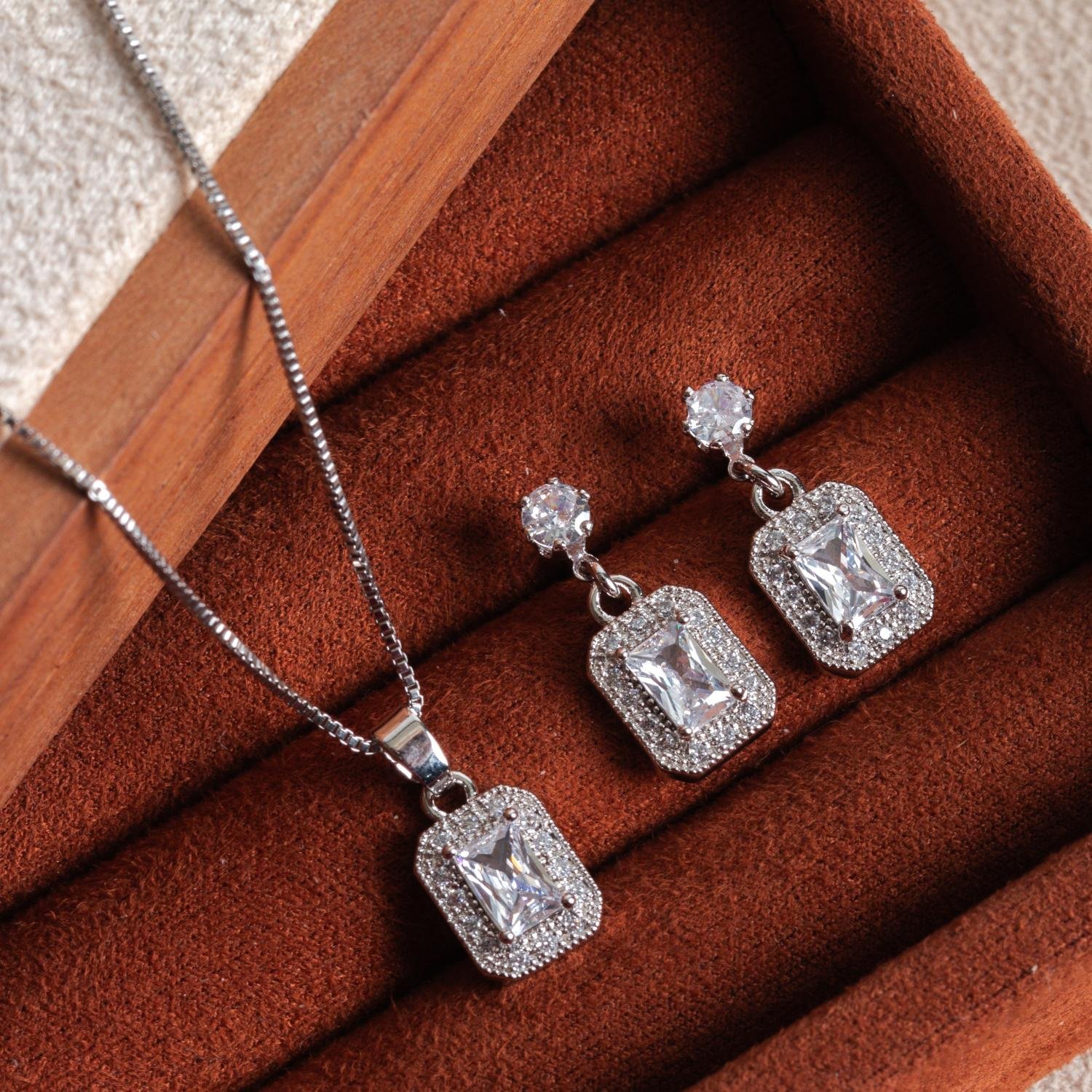 Encante-se com esse conjunto!Este lindo conjunto QUADRADO CRAVEJADO CRISTAL é feito com LATÃO BANHADO A RÓDIO BRANCO de alta qualidade.