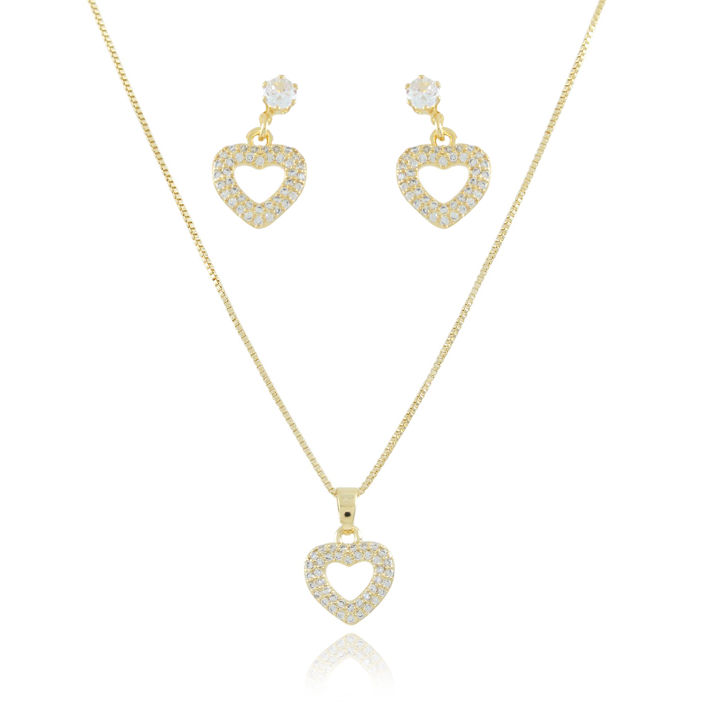 Encante-se com esse conjunto!Este lindo conjunto DE CORAÇÃO CRAVEJAO DE ZIRCÔNIAS CRISTAIS é feito com LATÃO BANHADO A OURO 18K de alta qualidade.