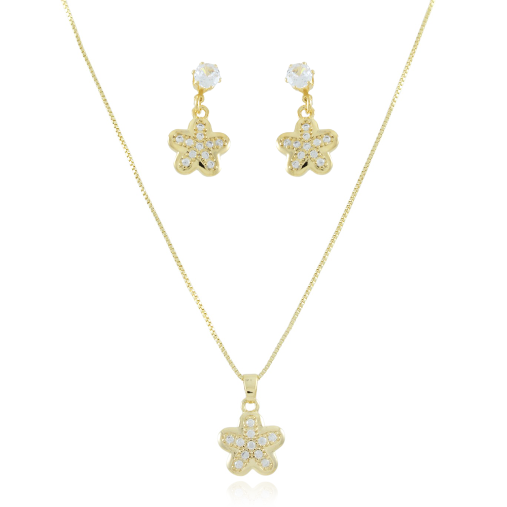 Encante-se com esse conjunto!Este lindo conjunto DE FLOR CRAVEJADO CRISTAL é feito com LATÃO BANHADO A OURO 18K de alta qualidade.