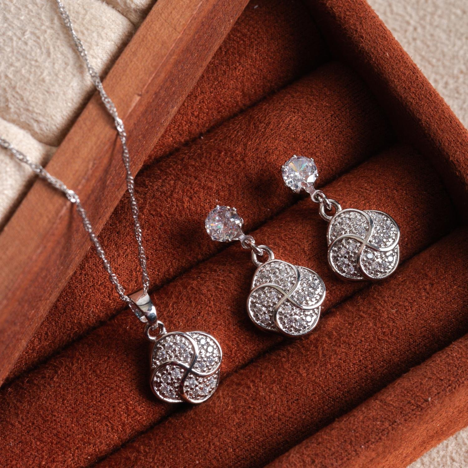 Encante-se com esse conjunto!Este lindo conjunto CRAVEJADO DE ZIRCÔNIAS CRISTAIS é feito com LATÃO BANHADO A RÓDIO BRANCO de alta qualidade.