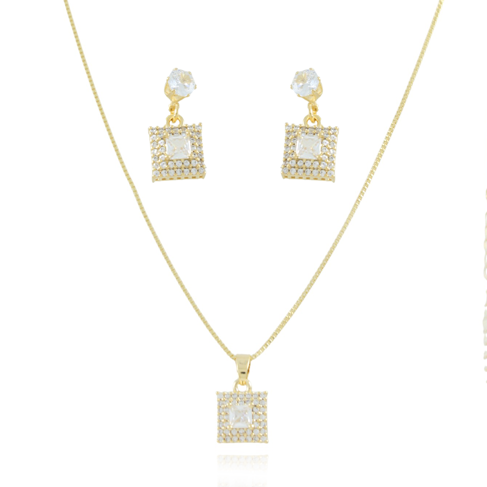 Encante-se com esse conjunto!Este lindo conjunto QUADRADO CRAVEJADO DE ZIRCÔNIAS CRISTAIS é feito com LATÃO BANHADO A OURO 18K de alta qualidade.
