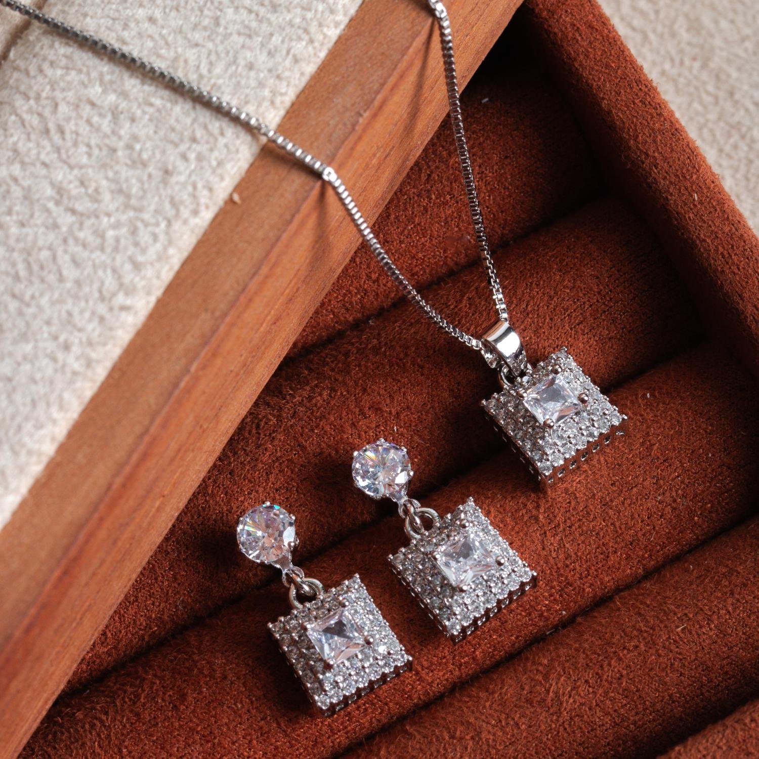 Encante-se com esse conjunto!Este lindo conjunto QUADRADO CRAVEJADO CRISTAL é feito com LATÃO BANHADO A RÓDIO BRANCO de alta qualidade.