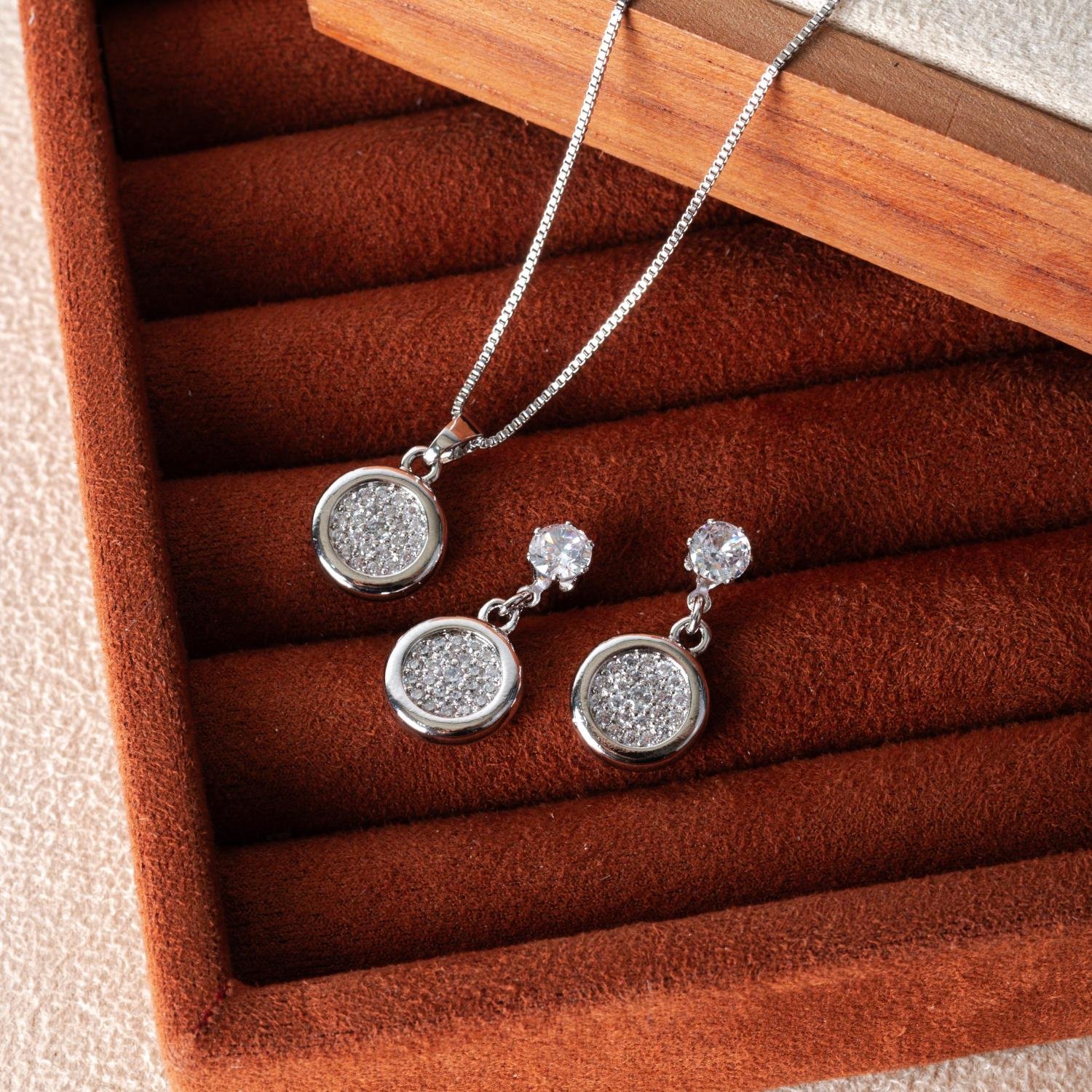 Encante-se com esse conjunto!Este lindo conjunto CRAVEJADO DE ZIRCÔNIAS CRISTAIS é feito com LATÃO BANHADO A RÓDIO BRANCO de alta qualidade.