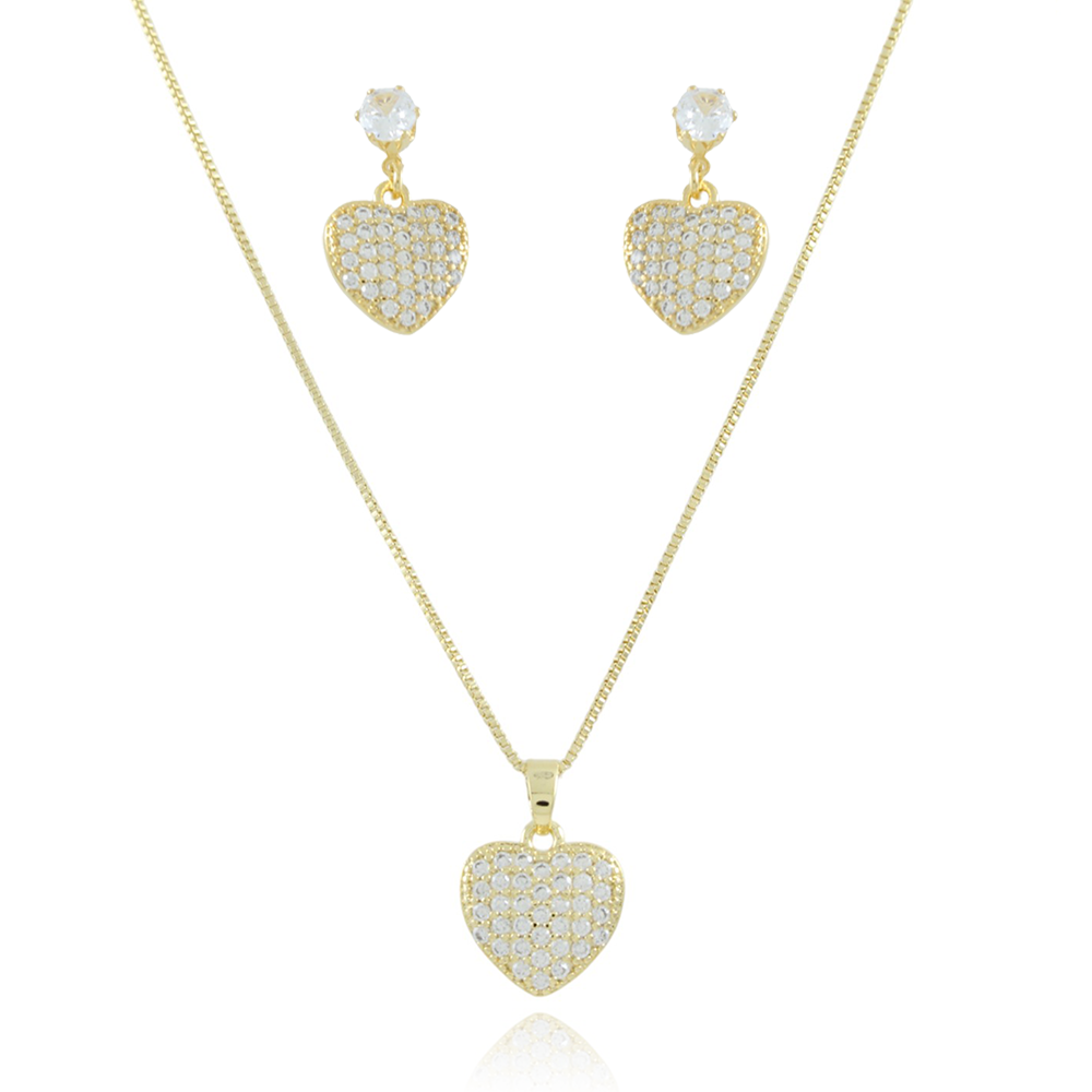 Encante-se com esse conjunto!Este lindo conjunto DE CORAÇÃO CRAVEJADO CRISTAL é feito com LATÃO BANHADO A OURO 18K de alta qualidade.