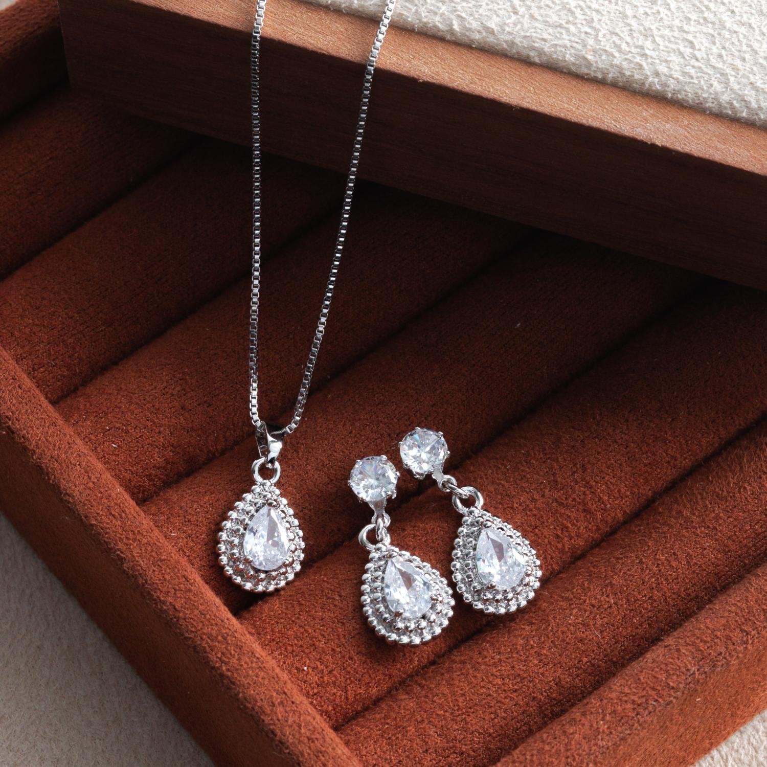 Encante-se com esse conjunto!Este lindo conjunto GOTA COM ZIRCÔNIA CRISTAL é feito com LATÃO BANHADO A RÓDIO BRANCO de alta qualidade.