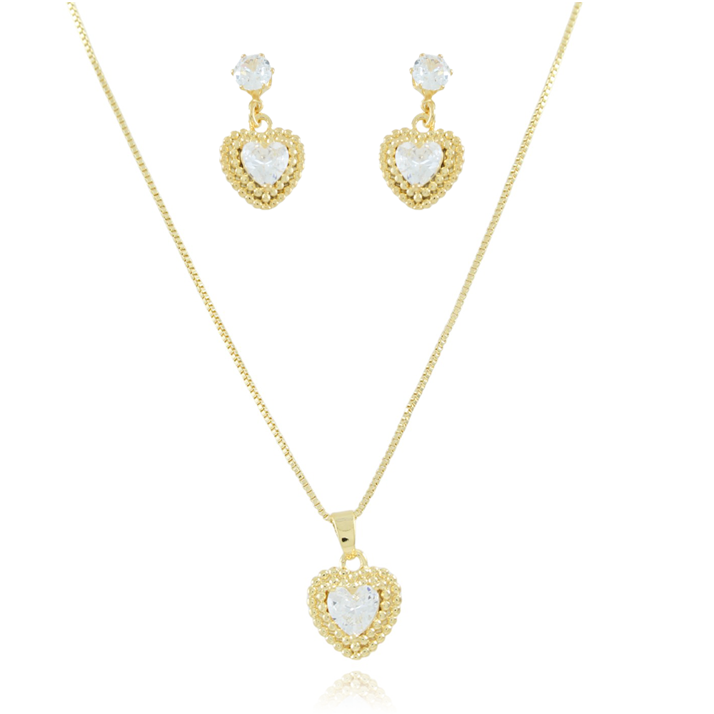 Encante-se com esse conjunto!Este lindo conjunto DE CORAÇÃO COM ZIRCÔNIA CRISTAL é feito com LATÃO BANHADO A OURO 18K de alta qualidade.
