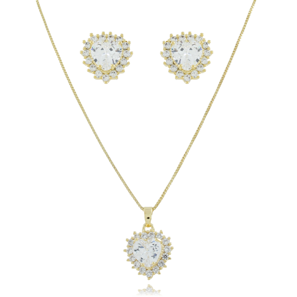 Encante-se com esse conjunto!Este lindo conjunto DE CORAÇÃO CRAVEJADO DE ZIRCÔNIAS CRISTAIS é feito com LATÃO BANHADO A OURO 18K de alta qualidade.