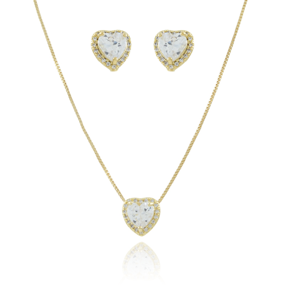 Encante-se com esse conjunto!Este lindo conjunto DE CORAÇÃO CRAVEJADO CRISTAL é feito com LATÃO BANHADO A OURO 18K de alta qualidade.