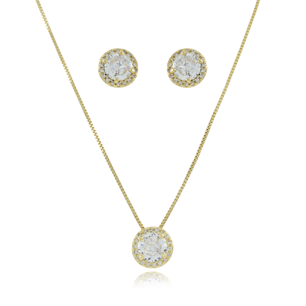 Encante-se com esse conjunto!Este lindo conjunto REDONDO CRAVEJADO DE ZIRCÔNIAS CRISTAIS é feito com LATÃO BANHADO A OURO 18K de alta qualidade.