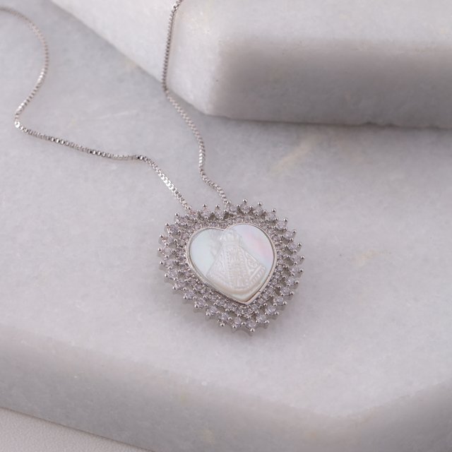 Encante-se com esse colar!Este lindo colar DE CORAÇÃO CRAVEJADO DE ZIRCÔNIAS CRISTAIS NOSSA SENHORA APARECIDA é feito com LATÃO BANHADO A RÓDIO BRANCO de alta qualidade.