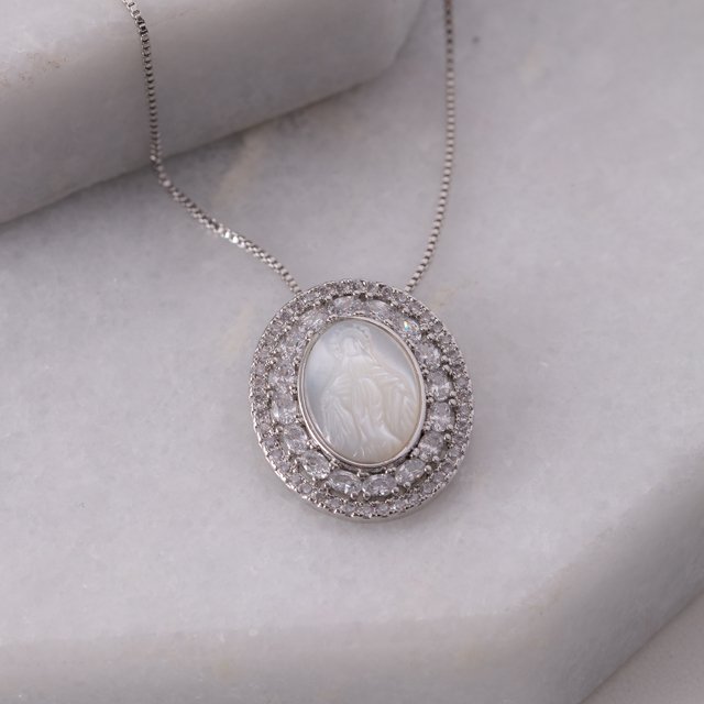Encante-se com esse colar!Este lindo colar CRAVEJADO DE ZIRCÔNIAS CRISTAIS NOSSA SENHORA DAS CRAÇAS é feito com LATÃO BANHADO A RÓDIO BRANCO de alta qualidade.