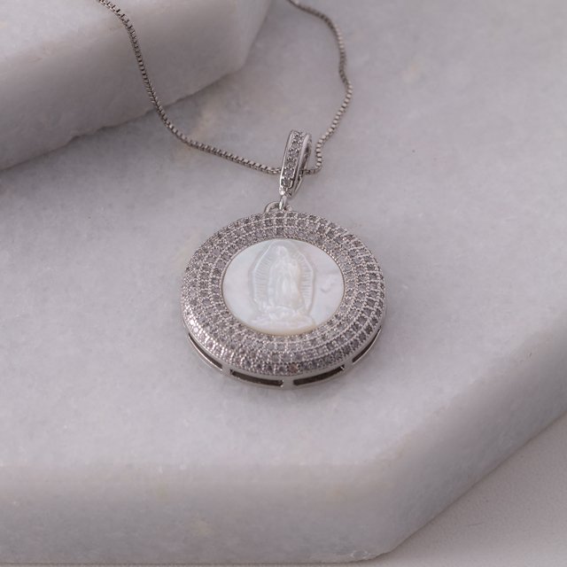 Encante-se com esse colar!Este lindo colar CRAVEJADO DE ZIRCÔNIAS CRISTAIS NOSSA SENHORA DE GUADALUPE é feito com LATÃO BANHADO A RÓDIO BRANCO de alta qualidade.
