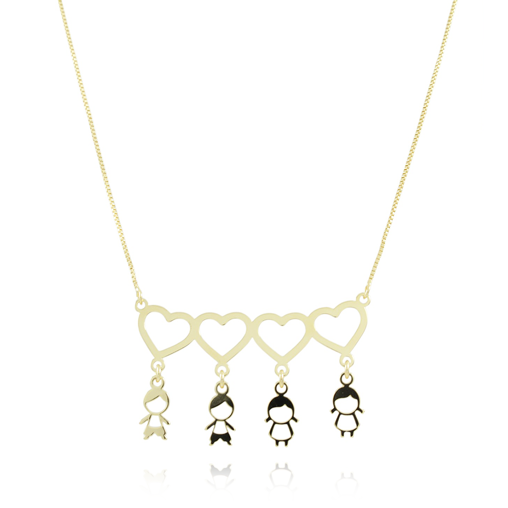 Encante-se com esse colar!Este lindo colar COM QUATRO CORAÇÕES E PINGENTES DE DUAS MENINAS E DOIS MENINOS é feito com LATÃO BANHADO A OURO 18K de alta qualidade.