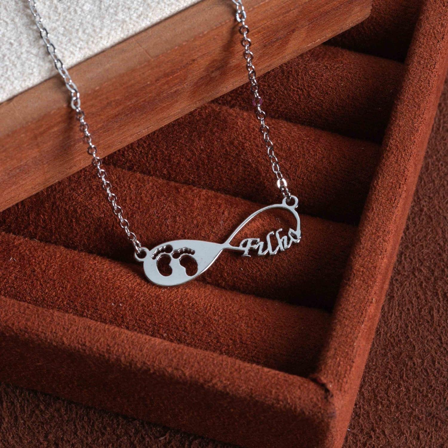 Encante-se com esse colar!Este lindo colar INFINITO FILHA COM PÉZINHOS é feito com LATÃO BANHADO A RÓDIO BRANCO de alta qualidade.