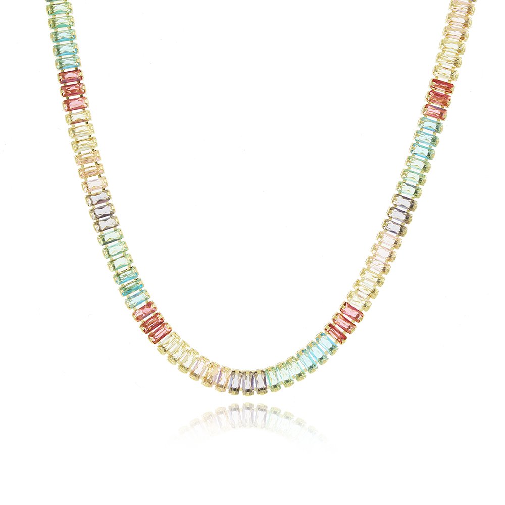 Encante-se com esse colar!Este lindo colar RIVIERA BAGUETE COLORIDO é feito com LATÃO BANHADO A OURO 18K de alta qualidade.
