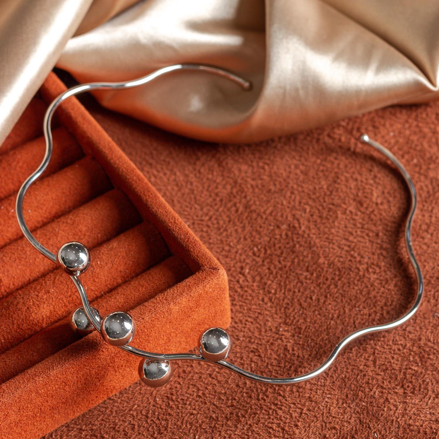 Encante-se com esse colar!Este lindo colar CHOKER ARO ONDULADO COM BOLINHAS é feito com LATÃO BANHADO A RÓDIO BRANCO de alta qualidade.