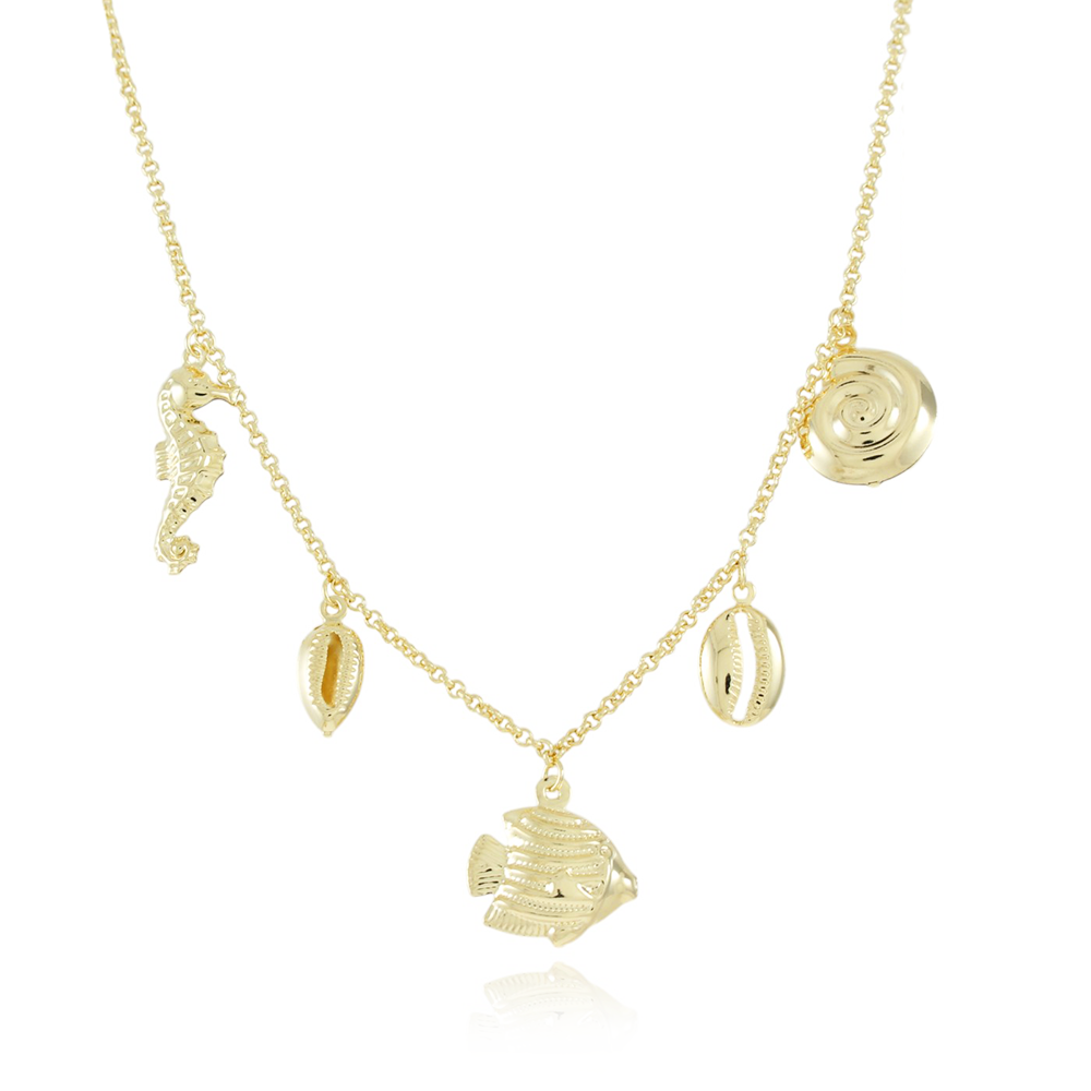Encante-se com esse colar!Este lindo colar COM PINGENTES DE CONCHAS, PEIXE E CAVALO MARINHO é feito com LATÃO BANHADO A OURO 18K de alta qualidade.