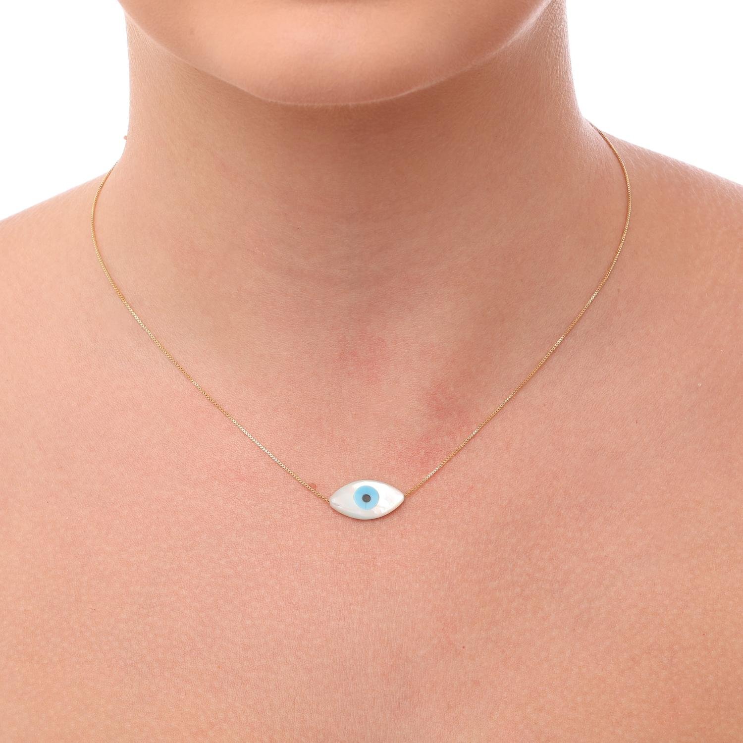 Encante-se com esse colar!Este lindo colar de olho grego em madrepérola - 10mm. é feito com LATÃO BANHADO A OURO 18K de alta qualidade.