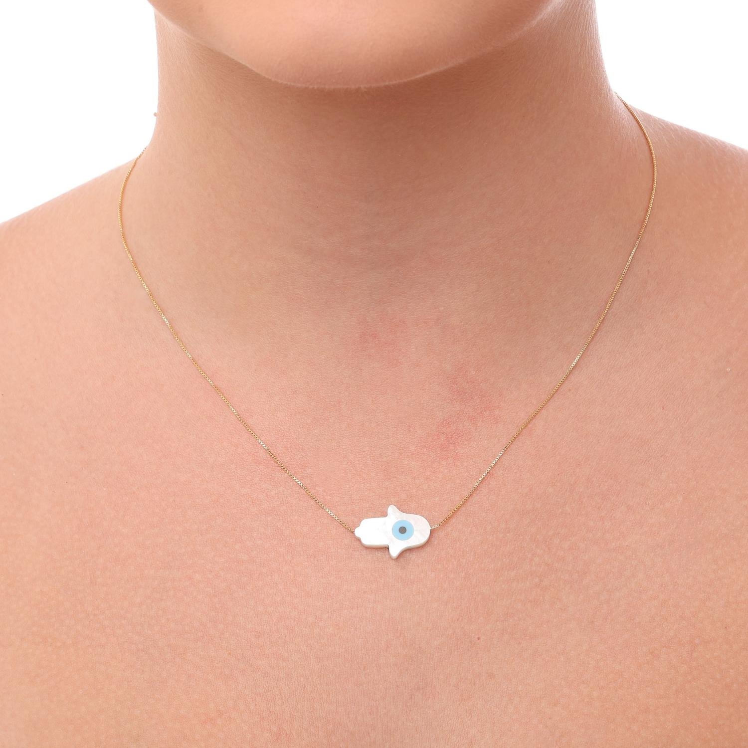 Encante-se com esse colar!Este lindo colar de mão de Fátima com olho grego. é feito com LATÃO BANHADO A OURO 18K de alta qualidade.