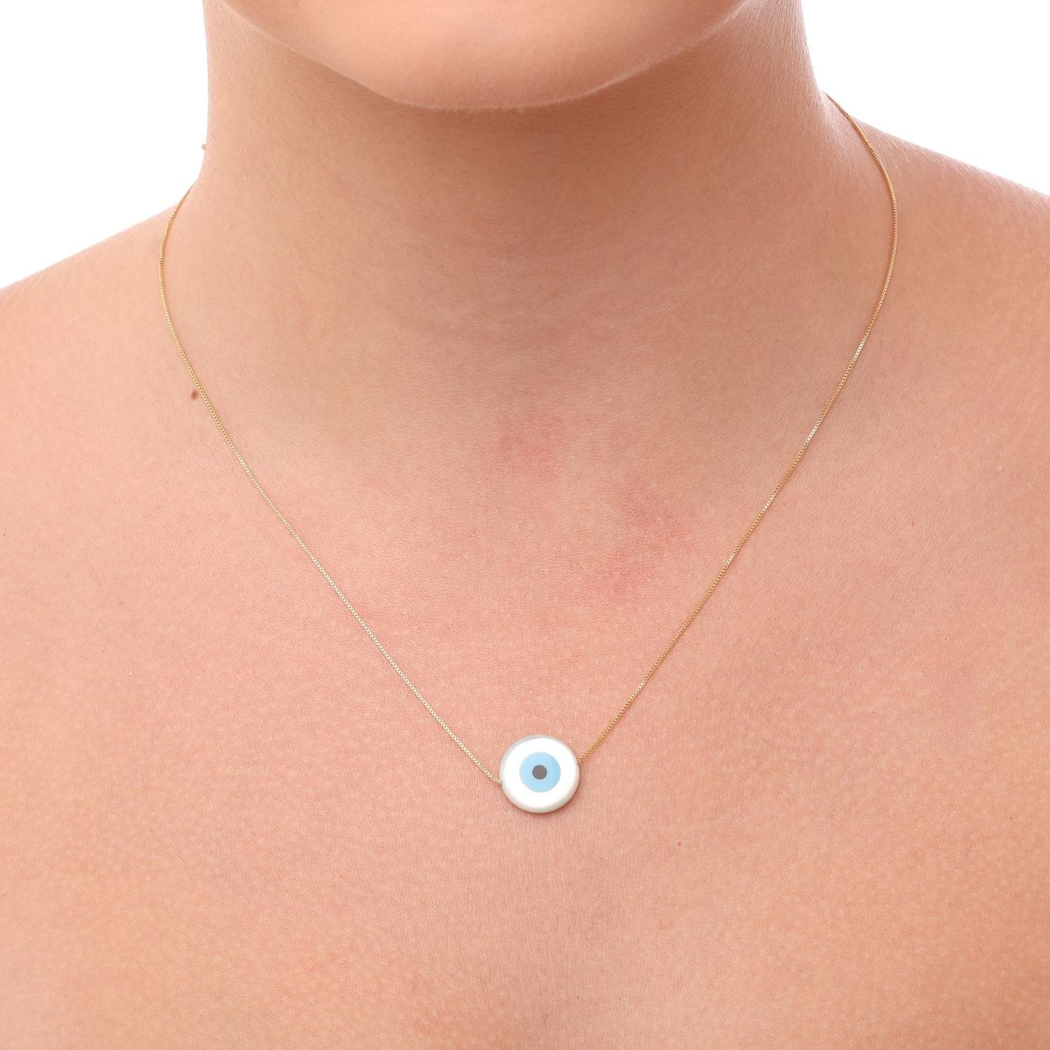 Encante-se com esse colar!Este lindo colar de olho grego com madrepérola - 14mm. é feito com LATÃO BANHADO A OURO 18K de alta qualidade.