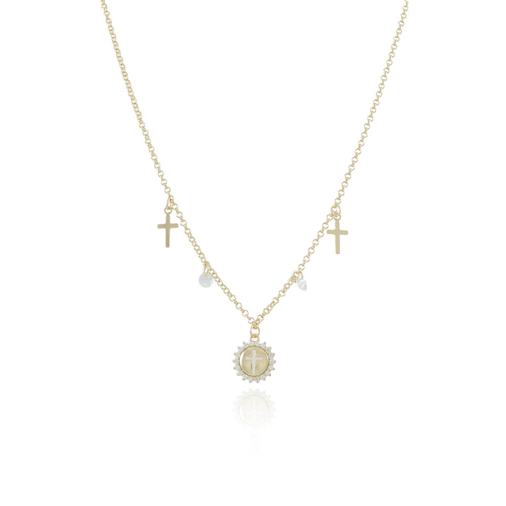 Encante-se com esse colar!Este lindo colar COM PINGENTES DE CRUZ, ZIRCÔNIAS CRISTAIS E MEDALHA CRAVEJADA COM CRUZ é feito com LATÃO BANHADO A OURO 18K de alta qualidade.