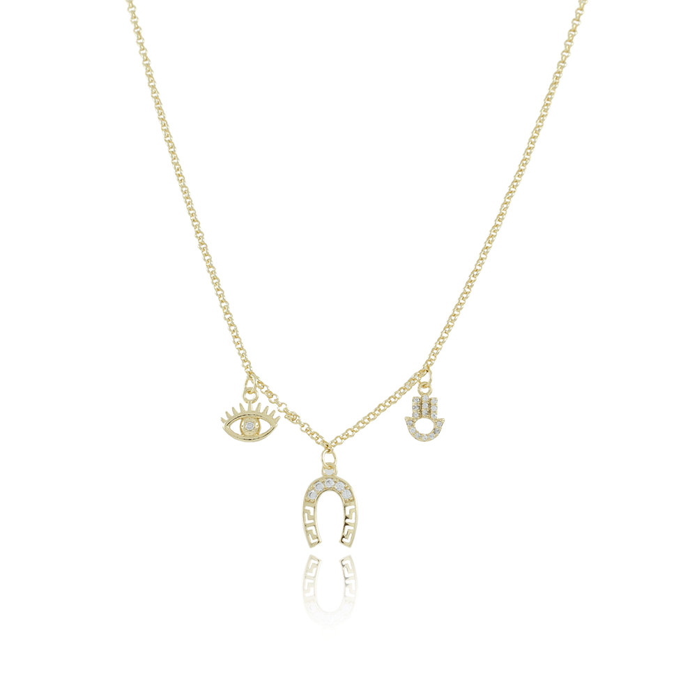Encante-se com esse colar!Este lindo colar PROTEÇÃO COM OLHO GREGO, FERRADURA E MÃO DE FÁTIMA CRISTAL é feito com LATÃO BANHADO A OURO 18K de alta qualidade.