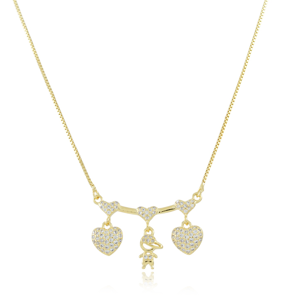 Encante-se com esse colar!Este lindo colar COM DOIS CORAÇÕES E UM MENINO CISTAL COM RÓDIO é feito com LATÃO BANHADO A OURO 18K de alta qualidade.