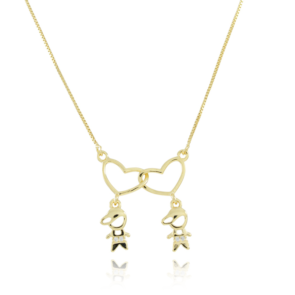 Encante-se com esse colar!Este lindo colar COM DOIS CORAÇÔES VAZADOS E MENINOS CISTAL COM RÓDIO é feito com LATÃO BANHADO A OURO 18K de alta qualidade.