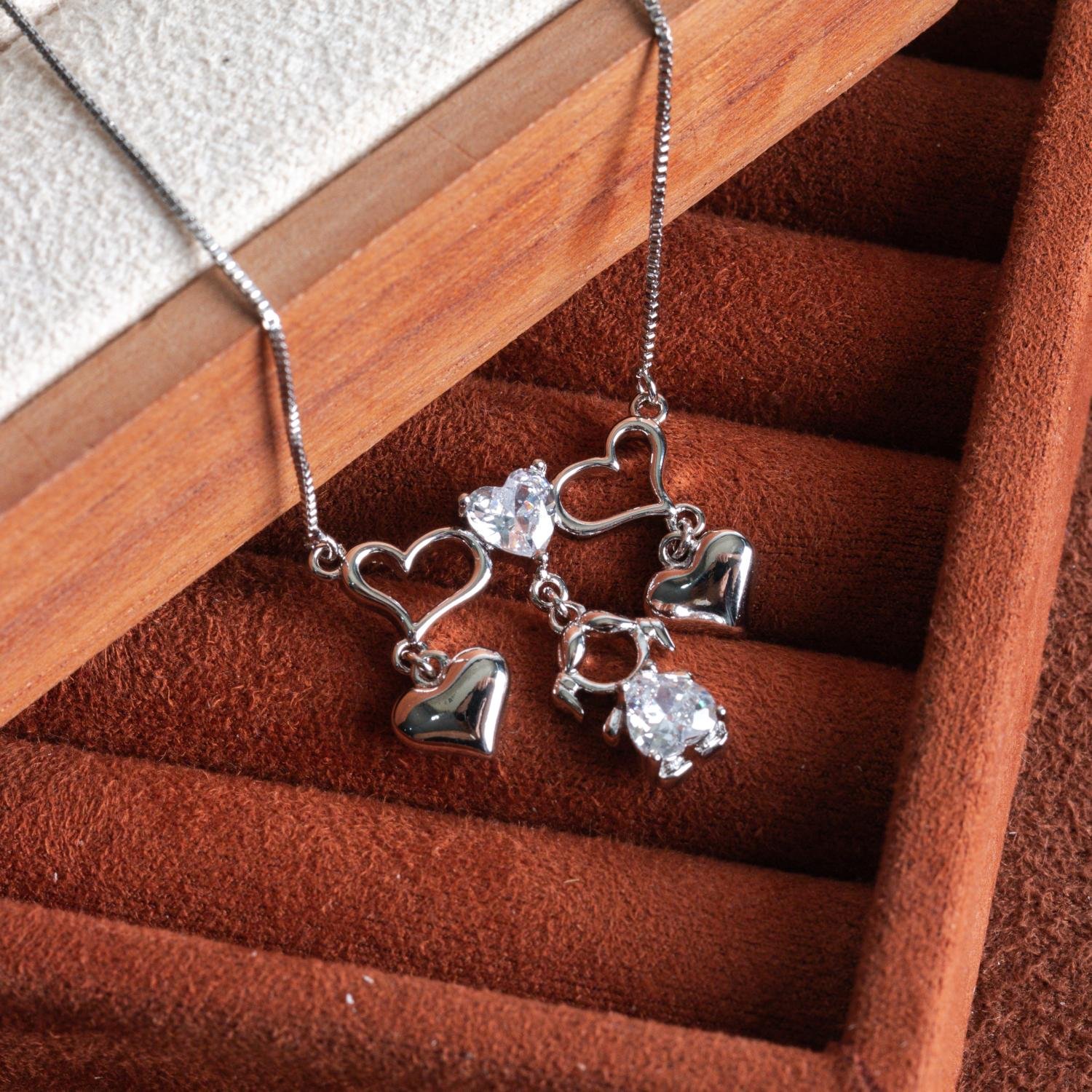 Encante-se com esse colar!Este lindo colar DE CORAÇÕES COM MENINA CRISTAL é feito com LATÃO BANHADO A RÓDIO BRANCO de alta qualidade.
