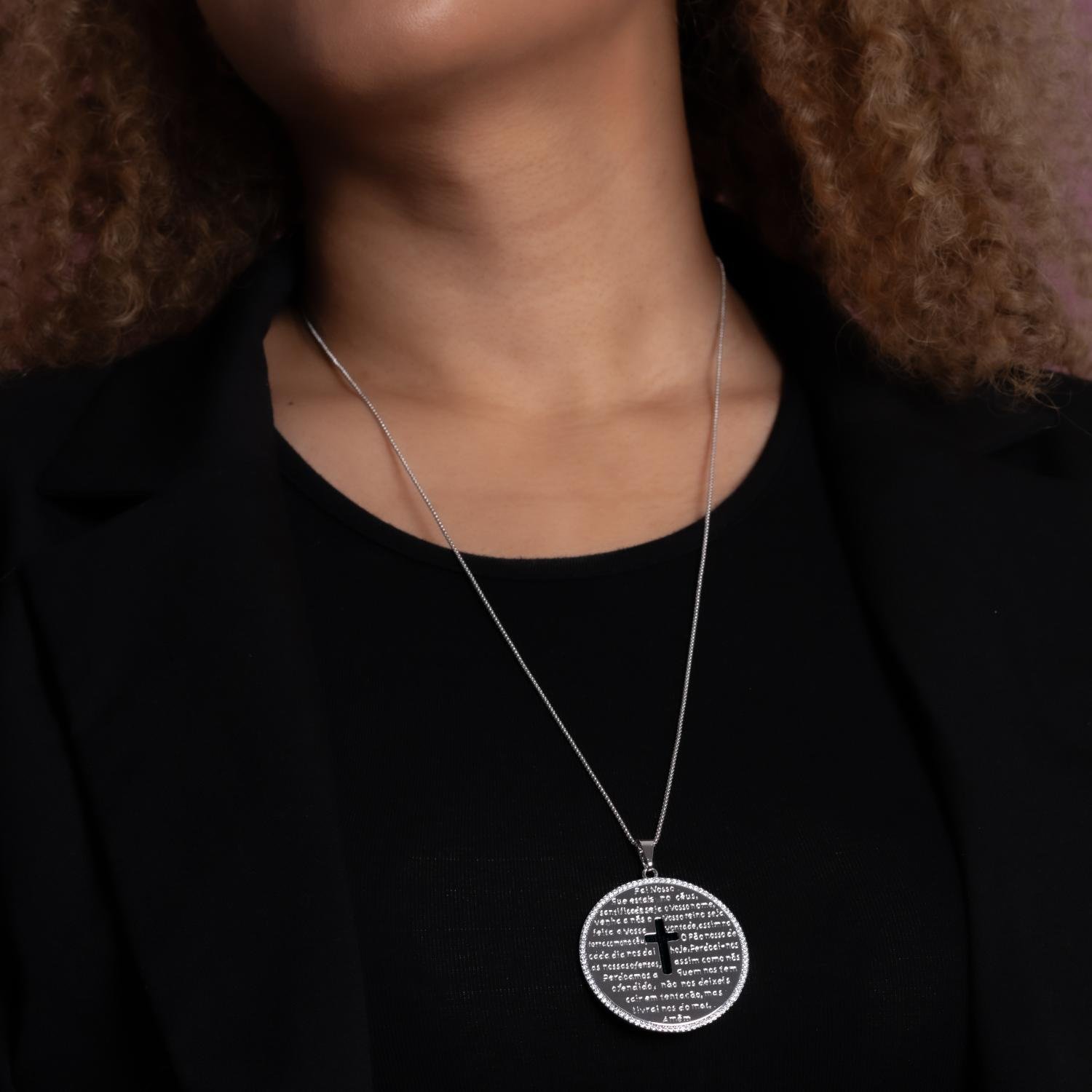 Encante-se com esse colar!Este lindo colar RELIGIOSO COM ORAÇÃO PAI NOSSO E CRUZ VAZADA CRISTAL é feito com LATÃO BANHADO A RÓDIO BRANCO de alta qualidade.