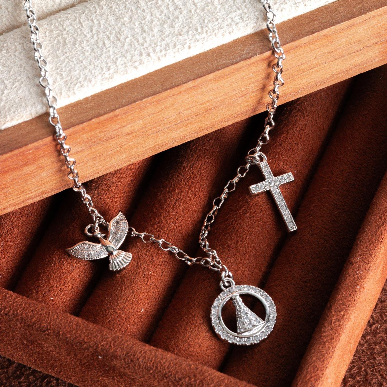 Encante-se com esse colar!Este lindo colar RELIGIOSO COM PINGENTES DE ESPÍRITO SANTO, NOSSA SENHORA E CRUZ CRISTAL é feito com LATÃO BANHADO A RÓDIO BRANCO de alta qualidade.