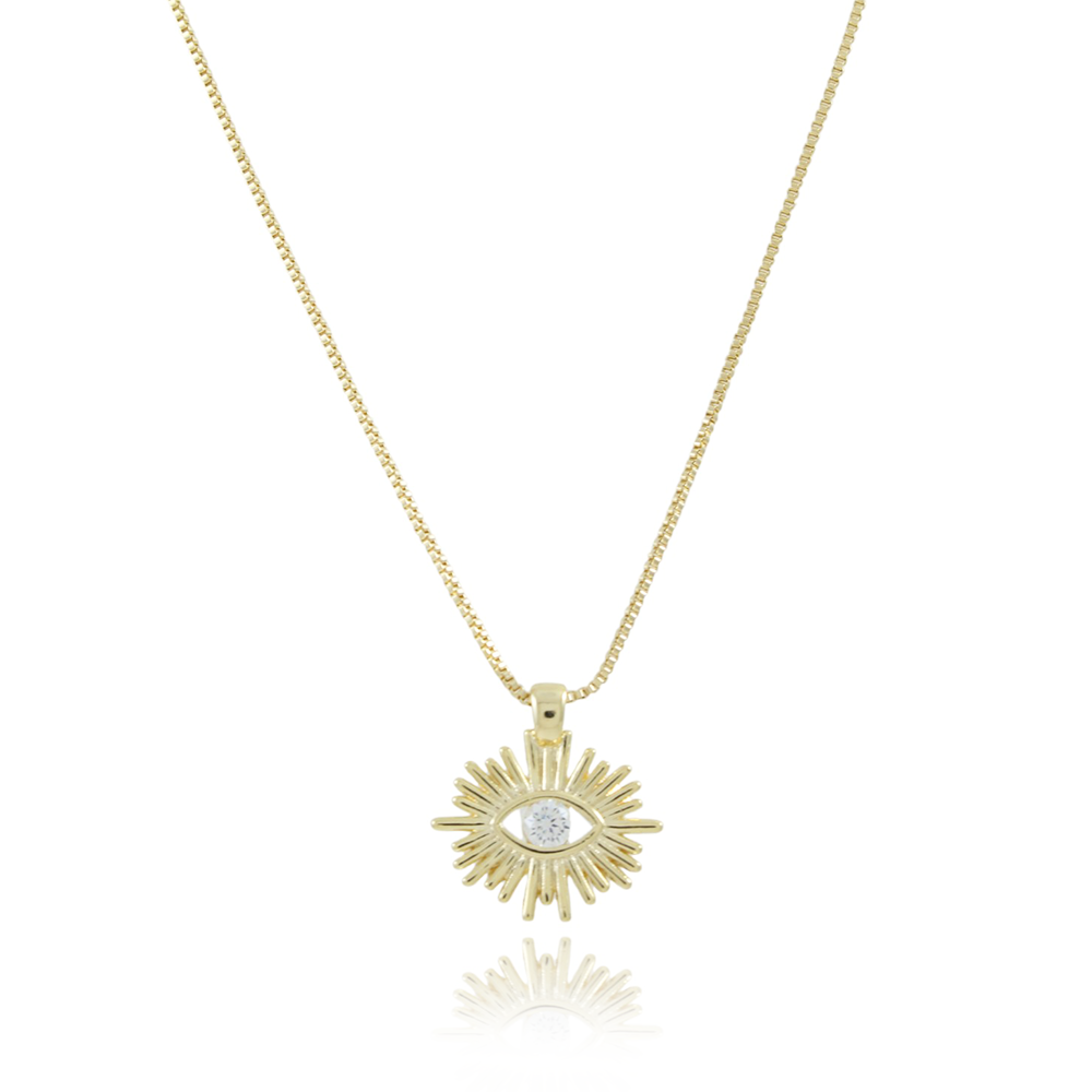 Encante-se com esse colar!Este lindo colar OLHO GREGO CRAVEJADO DE ZIRCÔNIAS CRISTAIS é feito com LATÃO BANHADO A OURO 18K de alta qualidade.