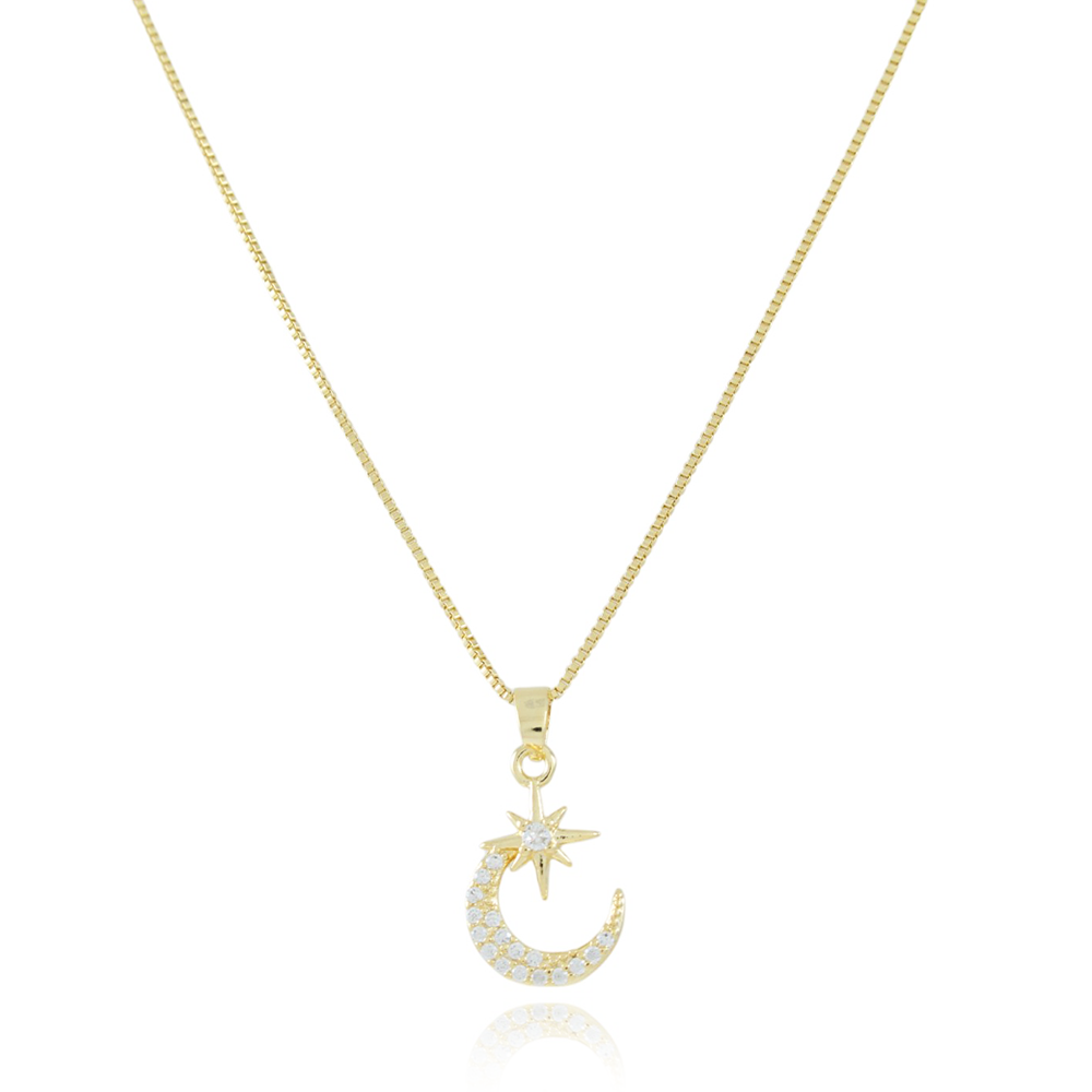 Encante-se com esse colar!Este lindo colar COM PINGENTE DE LUA E ESTRELA CRAVEJADO DE ZIRCÔNIAS CRISTAIS é feito com LATÃO BANHADO A OURO 18K de alta qualidade.