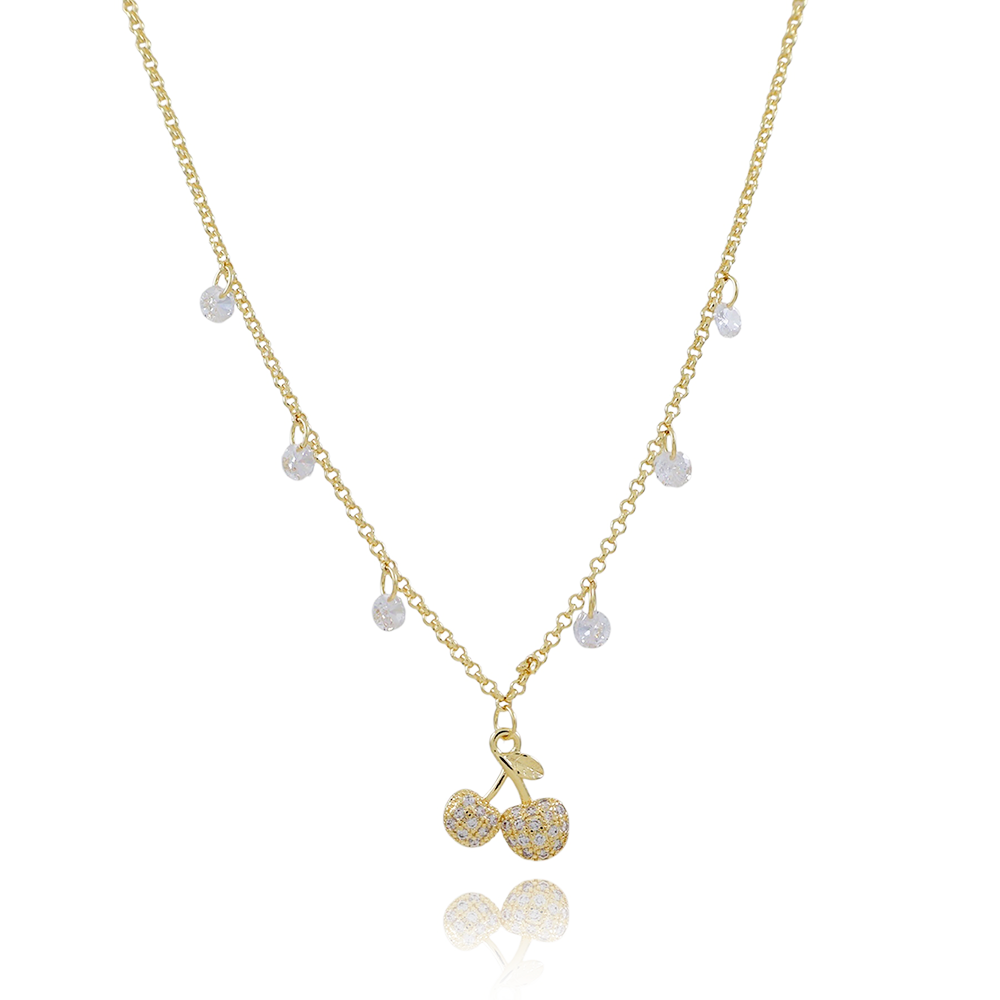 Encante-se com esse colar!Este lindo colar COM PINGENTE DE CEREJA CRAVEJADA E ZIRCÔNIAS CRISTAIS é feito com LATÃO BANHADO A OURO 18K de alta qualidade.