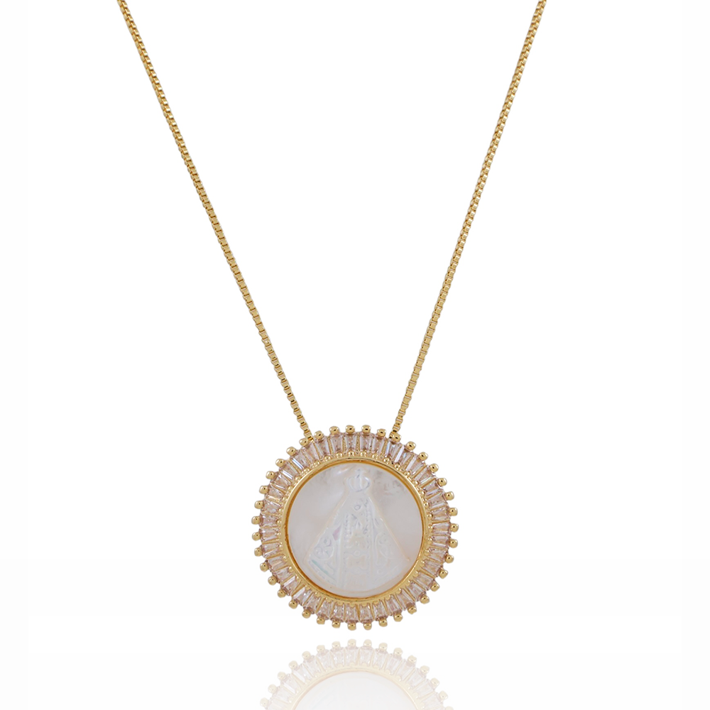 Encante-se com esse colar!Este lindo colar RELIGIOSO COM PINGENTE CRISTAL E NOSSA SENHORA APARECIDA EM MADREPÉROLA é feito com LATÃO BANHADO A OURO 18K de alta qualidade.
