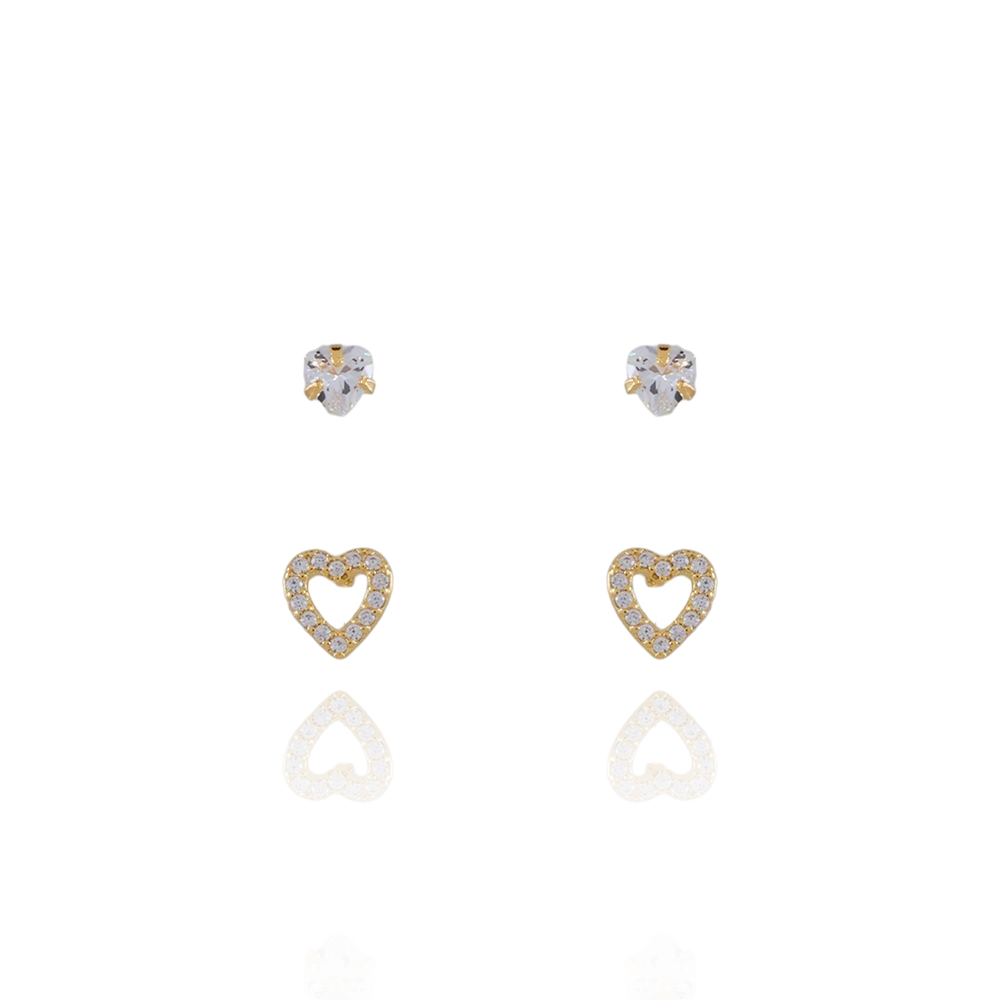 Encante-se com esse brinco!Este lindo brinco DUPLO DE CORAÇÕES CRAVEJADOS DE ZIRCÔNIAS CRISTAIS é feito com LATÃO BANHADO A OURO 18K de alta qualidade.