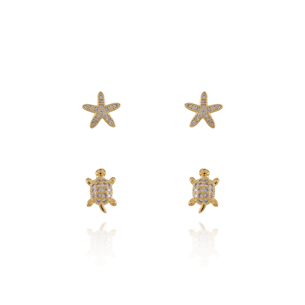 Encante-se com esse brinco!Este lindo brinco DUPLOS DE ESTRELA DO MAR E TARTARUGA CRISTAL é feito com LATÃO BANHADO A OURO 18K de alta qualidade.
