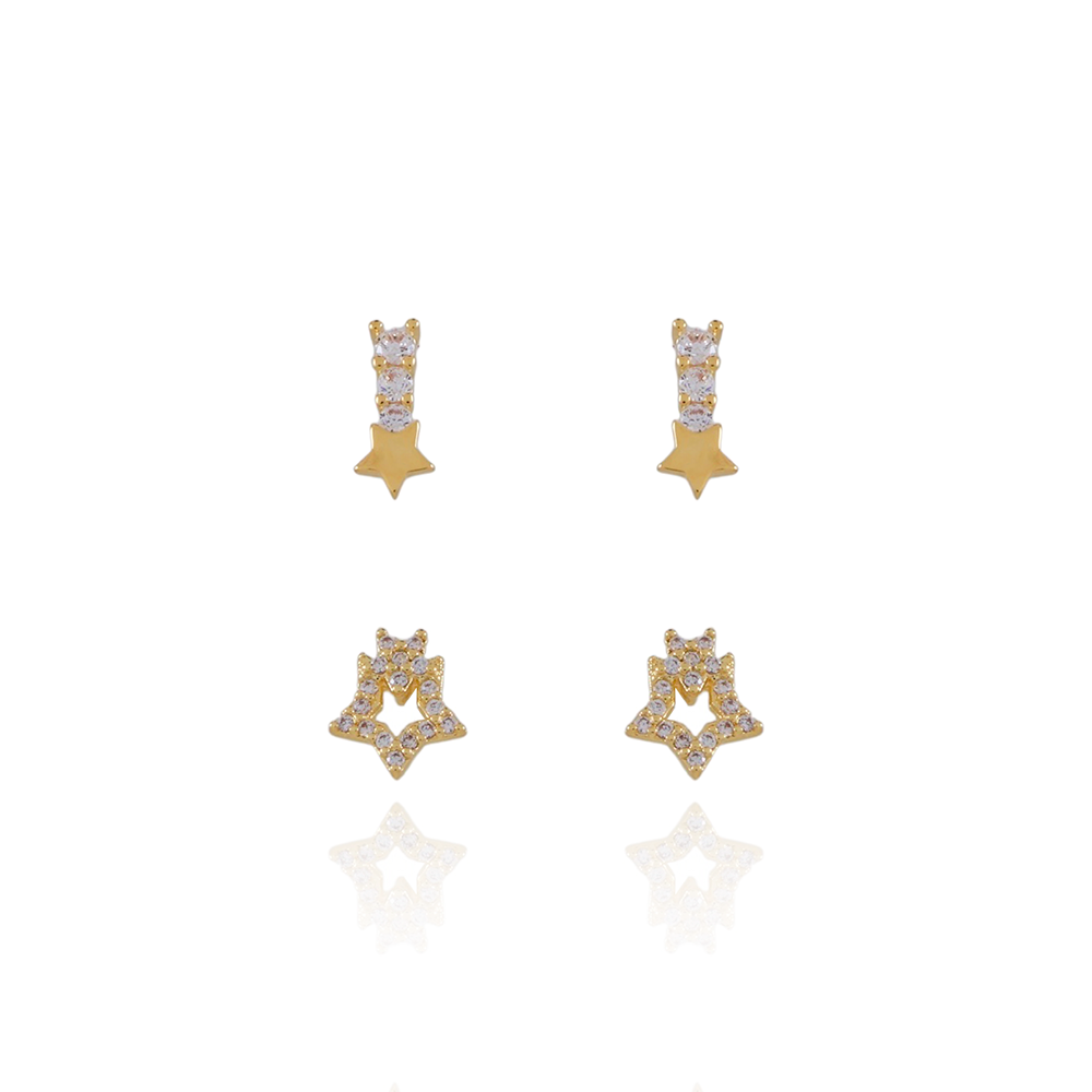 Encante-se com esse brinco!Este lindo brinco DUPLOS DE ESTRELAS CRAVEJADOS DE ZIRCÔNIAS CRISTAIS é feito com LATÃO BANHADO A OURO 18K de alta qualidade.