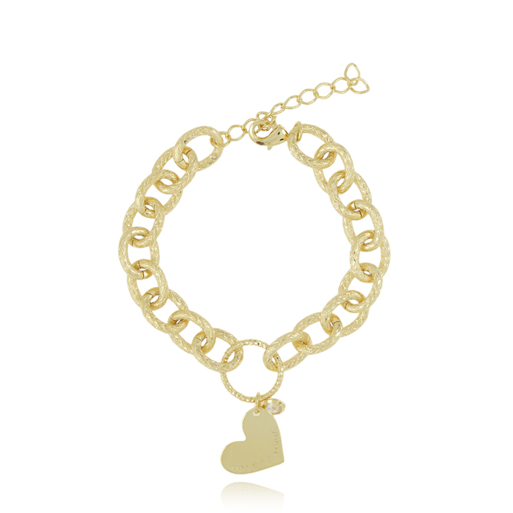 Encante-se com essa pulseira!Esta linda pulseira DE ELOS DETALHADOS COM PINGENTE DE CORAÇÃO ESCRITO AMOR ETERNO COM PONTO DE LUZ CRISTAL é feita com LATÃO BANHADO A OURO 18K de alta qualidade.