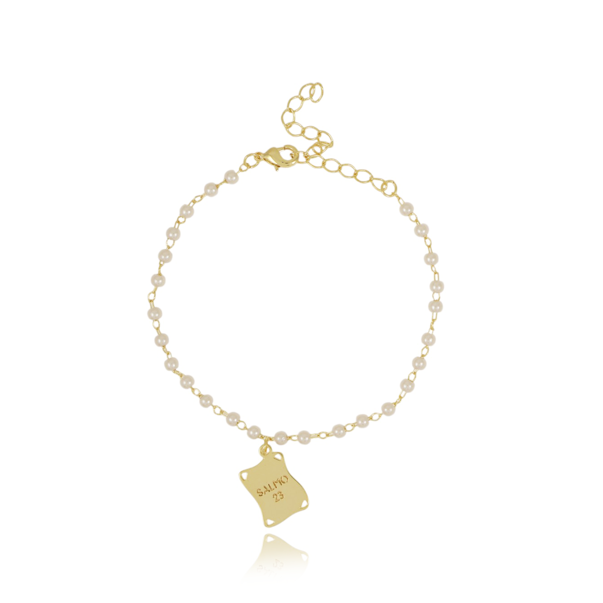 Encante-se com essa pulseira!Esta linda pulseira DE PÉROLAS COM PINGENTE SALMO 23 é feita com LATÃO BANHADO A OURO 18K de alta qualidade.