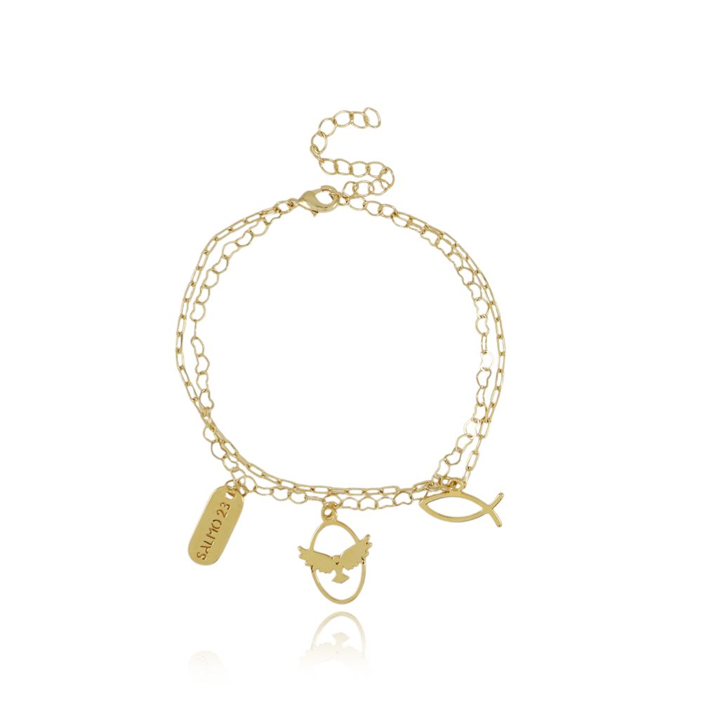 Encante-se com essa pulseira!Esta linda pulseira DUPLA DE ELOS DE CORAÇÕES E PINGENTES RELIGIOSOS é feita com LATÃO BANHADO A OURO 18K de alta qualidade.