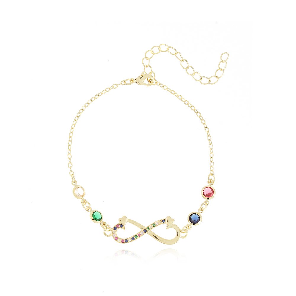 Encante-se com essa pulseira!Esta linda PULSEIRA SIMBULO DO INFINITO E CORAÇÃO CRAVEJADA COLORIDA é feita com LATÃO BANHADO A OURO 18K de alta qualidade.
